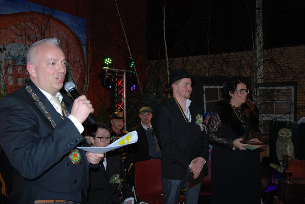 Daarna vroeg onze nieuwe burgemeester de aanwezigen in de zaal een erehaag te vormen om via deze haag de leden van het boerenbruiloft gezelschap een voor een naar voor te roepen. Op het podium werden ze met een luchtige toespraak verwelkomt.