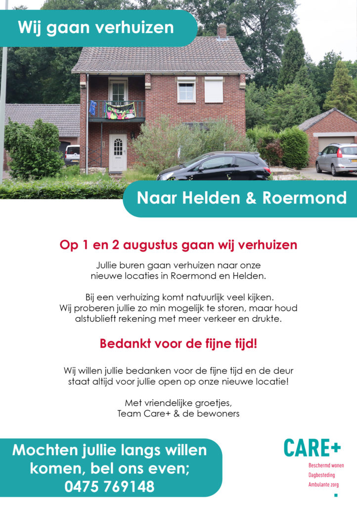 De woonvorm van Care+ op de St. Servaasweg gaat verhuizen. De bewoners gaan naar locaties in Helden en Roermond. Zie in dit verband ook onderstaand verhuisbericht.